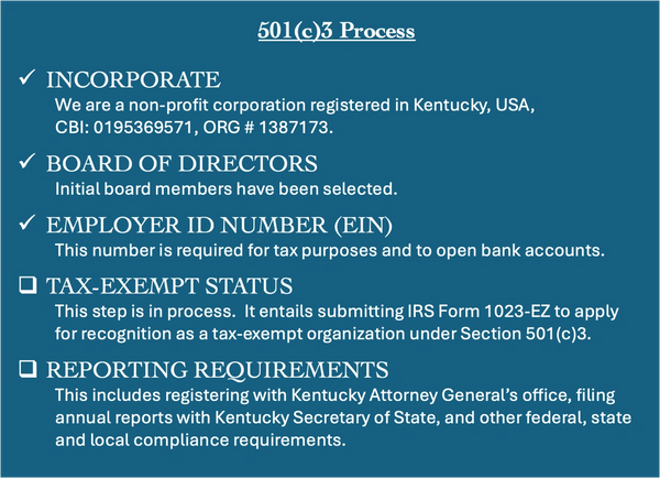 We are actively pursuing tax-exemption status as a 501(c)3 non-profit organization.