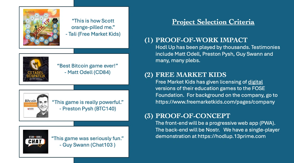The purpose of the FOSE Foundation is to empower individuals and communities through free and open-source education. We aim to promote money literacy and other first-principles education by integrating game schooling techniques that make learning both engaging and accessible. In one sentence, FOSE transforms proven educational games from the physical to the digital, literally expanding their impact to the whole world.